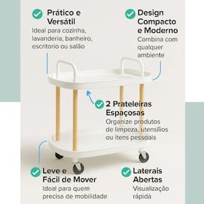 Uma opção prática e versátil para quem precisa de funcionalidade no dia a dia. Com estrutura resistente e design compacto, ele é ideal para manter itens organizados e sempre à mão em diversos ambientes, como cozinha, lavanderia, banheiro, escritório ou salão de beleza. Suas duas prateleiras espaçosas permitem armazenar desde produtos de limpeza até utensílios, materiais de trabalho ou itens pessoais. Seu formato leve facilita o transporte, sendo perfeito para quem precisa de mobilidade e organização em um só produto. As laterais abertas proporcionam fácil visualização e acesso rápido aos objetos, enquanto o design moderno se adapta facilmente a diferentes estilos de decoração. É uma excelente escolha para otimizar espaços e manter tudo no lugar com praticidade e eficiência.