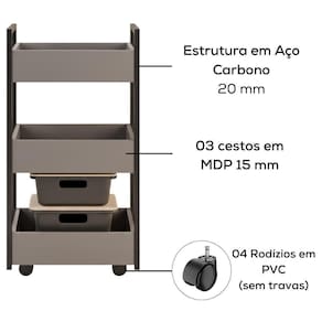 Carrinho Multiuso Lais, ideal para auxiliar na cozinha, lavanderia ou em qualquer ambiente que precise de apoio extra! Produzido em 100% MDP de 15 mm com acabamento em BP. Sua estrutura é confeccionada em aço carbono, conta com 3 cestos ideais para armazenamento de frutas, legumes e utensílios no dia a dia. Além de rodízios em PVC, permitindo fácil movimentação e praticidade na limpeza. Produto será entregue em 01 volume.