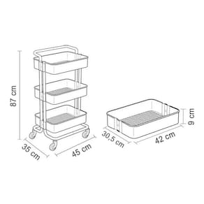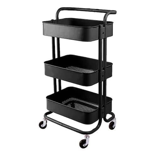 O carrinho multiuso com pintura epóxi resistente em aço 5 cores: preto, branco, turquesa, cinza e rosa possui 3 prateleiras com bordas e fundo de superfície vazada que suportam até 10kg cada prateleira. Seu fundo possui micro furos que eliminam eventuais resíduos líquidos. O carrinho possui alça e rodízios, se tornando prático para locomoção e decorativo em seu ambiente. Ideal para diversos ambientes e para seu negócio como: sala, banheiro, quarto, lavanderia, bar, quarto de criança, salão de beleza, oficina e escritório. Basta montar e começar a organizar.