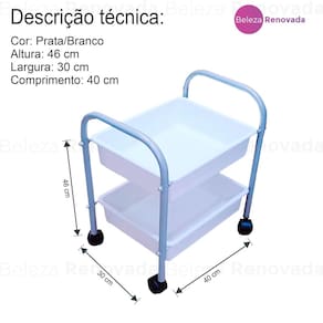 Atributos do Produto:O carrinho foi produzido com materiais de alta qualidade, proporcionando maior durabilidade e resistência. Com 4 rodinhas, é fácil de movimentar e transportar, tornando-se um aliado indispensável para profissionais da área de manicure e pedicure.
