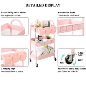 danpinera Carrinho de rodinhas de 3 camadas, carrinho de armazenamento de metal com rodas bloqueáveis e copos e ganchos suspensos, carrinho móvel para cozinha, banheiro, escritório, oficina, rosa