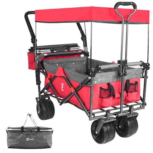 Quando dobrado, o carrinho tem um tamanho de aproximadamente 76 x 61 x 20 cm e um peso de aproximadamente 15,74 quilos. A alça telescópica é ajustável e pode ser estendida até 101 cm, proporcionando uma alça ajustável de 180 graus, permitindo que você empurre ou puxe o carrinho com facilidade. O carrinho também possui um cesto traseiro de 50 x 16 x 22 cm, uma bolsa térmica portátil à prova de vazamentos que mantém o frio por até 34 horas, muitos bolsos internos de armazenamento, um par de tiras de segurança de três pontos e um dossel removível que oferece proteção solar e à prova de chuva.