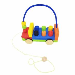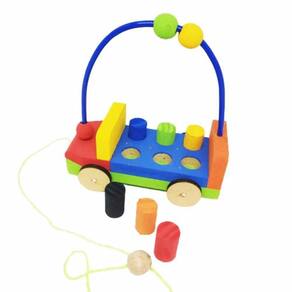 O Carro Aramado e Pinos de madeira é bem divertido, pois além da criança poder puxá-lo, alia duas brincadeiras: encaixe dos pinos coloridos e aramado.