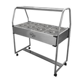 A função do Buffet térmico SPOLU é manter os alimentos servidos em suas cubas quentes enquanto em exposição. Possui cubas fabricadas em aço inox 201, tanque, tampas e moldura externa em aço inox 430 e estrutura de sustentação tubular. Sua resistência blindada é confeccionada em aço inox e controlada por um termostato com escala de 30C a 120C. Possui uma lâmpada piloto em seu painel indicando a função liga/desliga do termostato. Para facilitar a movimentação e o deslocamento a estrutura tubular é dotada de rodízios giratórios.