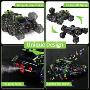 - Design exclusivo: o carro de controle remoto Dazzcool é equo com 4 rodas motrizes e 2 rodas giratórias, a parte superior do carro também é equa com 4 rodas pequenas, para que esses carros de controle remoto possam escalar obstáculos. A condução em dois lados está disponível ao encontrar um obstáculo intransponível. O carro também é equo com um efeito de spray de um botão, que é legal ao dirigir com nossas luzes e música.