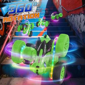 Jimdella Carro de controle remoto feito de materiais de alta qualidade e vem com acessórios ricos, incluindo: 1 carro RC, 1 controle remoto, 2 baterias recarregáveis de 500 mA, 2 pilhas AA, 4 rodas sobressalentes, 1 chave de fenda, 10 parafusos, 1 número de instruções de uso. Design exterior bem trabalhado. melhores presentes para meninos 8-12 presentes de aniversário - Carro RC AMBILIGHT - O carro RC Jimdella adota um design exclusivo de iluminação de roda. 26 luzes LED na carroceria do carro emitem luzes semelhantes a arco-íris, adicionam uma sensação de dinamismo e modernidade ao carro. Quando as crianças estão dirigindo ao ar livre, as luzes LED formarão uma linda pista de arco-íris, criando visuais deslumbrantes. O carro de acrobacias RC tem uma função de demonstração automática. Pressione o botão de demonstração para mostrar automaticamente performances incríveis de acrobacias, permitindo que as crianças mergulhem em festas divertidas e visuais de condução. - [Carro RC DIY forte e resistente] - O carro de controle remoto Jimdella é feito de plástico ABS forte e não tóxico, todo o carro é formado integralmente com uma estrutura forte, equipado com pneus de borracha duráveis anticolisão com absorção de choque, portanto, condições adversas não impedirão as crianças de sua aventura de corrida! Temos quatro pneus sobressalentes que podem ser substituídos, para que as crianças possam fazer você mesmo livremente seu próprio carro, as crianças podem mergulhar totalmente na aventura de corrida. melhores brinquedos para idades de 5 a 7 anos - Bateria dupla e super vida útil da bateria: o carro de controle remoto Jimdella vem com 2 peças de bateria recarregável de 500mA e cabo de carregamento USB – cada bateria pode funcionar por 30 minutos, você pode carregá-la facilmente em qualquer lugar com um adaptador, computador, carregador portátil. As crianças têm menos tempo de inatividade e garantem que você. A emoção dos pequenos pilotos continua enquanto eles se preparam para sua próxima aventura. Também incluímos duas baterias AA de 1,5 V para o controle RC, para que as crianças possam se divertir com o carro RC. - [Motores duplos de alto desempenho] - O carro RC de dupla face está equipado com 2 motores potentes sem escovas, que têm potência mais forte, velocidade máxima de até 15 km/h e uma forte capacidade de escalada, deixando você muito à frente na competição com seus amigos. Nosso controle remoto sem interferência de 2,4 GHz está equipado com tecnologia antiinterferência avançada para evitar interferência de sinal, proporcionando uma conexão perfeita entre o controle remoto e o carro. Controle preciso do seu carro mesmo no modo multijogador - [Carro de acrobacias de controle remoto JIMDELLA]-360 Flips Rotating Stunt RC Cars suporta uma variedade de acrobacias. Você pode usar o controle para controlar o carro para frente, para trás, para a esquerda, para a direita, rotação e rotação de 360 graus, trazendo diversão ilimitada. Ambos os lados dos carros RC estão equipados com faróis coloridos e faixa de luz colorida, que pode ser ligada e desligada livremente através do controle remoto.