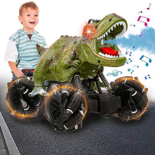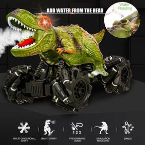 -?Carro de dinossauro multifuncional?: este brinquedo de dinossauro para crianças de 5 a 7 meninos e meninas com frente, para trás, esquerda 45 graus para frente para trás, direita 45 graus para frente para trás, rotação de 360 graus, spray de névoa, música e luzes LED chamativas