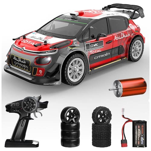 Este é o modelo de carro RC sem escova MJX 14303, com escala 1:14 e velocidade máxima de 42km/h. Com uma distância de controle remoto de até 120m, a bateria de 2S 2000MAH proporciona um tempo máximo de uso de 13min e tempo de carregamento de 4h usando um carregador 5V 2A e cabo de carregamento USB. As dimensões do produto são 320mm x 153mm x 115mm, com uma distância entre eixos de 192mm e diâmetro do pneu de 58mm. O motor sem escova de quatro pólos 2845 3900KV e o ESC sem escova independente de 45A proporcionam uma experiência de direção mais poderosa e eficiente. Além disso, o carro possui um amortecedor hidráulico totalmente metálico, cabeça de colisão de metal e sistema de transmissão totalmente metálico, incluindo o diferencial de engrenagem de metal, garantindo melhor tração e durabilidade. O carro de controle remoto vem com um independente padrão que é fácil de modificar e atualizar, permitindo que você personalize seu carro de acordo com suas preferências específicas. A lista de embalagem inclui o carro, controle remoto, bateria, manual, cabo de carregamento USB, chave hexagonal, chave de fenda, pneus TPR e pneus de drift.
