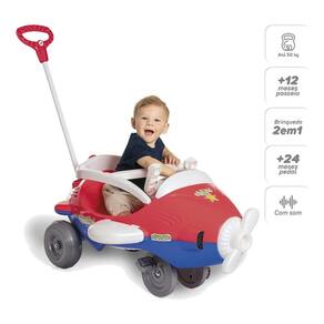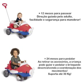 Direção e rodas guiadas pelo empurrador Encaixe e desencaixe o empurrador com praticidade Suporte para bolsa Asas removíveis Apoio pés Aro protetor com regulagem Hélice gira ao tocar Suporte para garrafas Com som de avião Acompanha Capacete de Brinquedo Calesita, transforma passeios em histórias