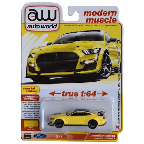 - Modelo die-cast altamente detalhado na escala 1:64 do Ford Mustang Shelby GT-500 Carbon Fiber Track Pack 2021.