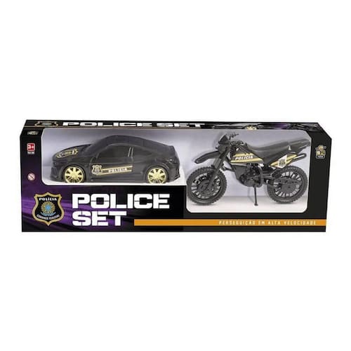 - Produto: Carro e Moto Police Set - Marca: BS Toys - Coleção: Police Set - Tema: Police Set - Tipo: Veículos - Contém: 1 moto e 1 carro - Código de Barras: 7898002433062 - Recomendação: Indicado para Crianças a partir de 03 anos