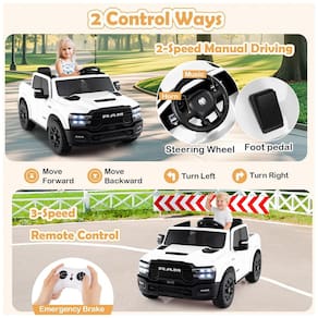 O Costzon Ram 2500 Rebel Licenciado é um carro elétrico infantil premium para até 2 crianças, equipado com dois motores de 100W e bateria de 24V, ideal para experiências de passeio de alto desempenho em áreas residenciais. Oferece velocidade ajustável de 2,2 a 5,2 km/h, controle duplo (operador interno e controle remoto para os pais) com três níveis de velocidade e freio de emergência via controle remoto, garantindo segurança adicional. A suspensão em todas as rodas com 4 amortecedores independentes proporciona condução confortável em vários tipos de piso (asfalto, madeira, bloco, cascalho ou grama), e o sistema "soft start" evita trancos e sustos ao ligar ou desligar.