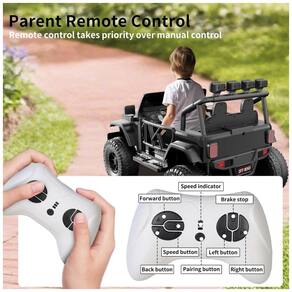 Dispõe de suspensão independente nas quatro rodas, pneus em PP antiderrapante, partida suave (soft start) e joystick ou volante para operação infantil. O controle remoto parental (alcance até 100 m) permite direção, mudança de sentido, ajuste de velocidade e acionamento da função de segurança com frenagem de emergência.