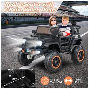 O assento duplo de 51 cm de largura comporta facilmente duas crianças pequenas (3 a 5 anos) ou uma criança maior (4 a 8 anos), entregando conforto e proteção, com cintos de segurança de três pontos individuais. O controle pode ser manual ou remoto, com três velocidades ajustáveis pelo responsável, incluindo sistema de partida e frenagem suave.