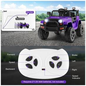 Operação manual e controle remoto 2.4G Este passeio no caminhão pode ser operado por crianças pressionando o botão para frente, parar, para trás, operando o volante e pisando no pedal. E o controle remoto 2.4G pode ser operado pelos pais com 3 velocidades ajustáveis para controlar o passeio no carro a uma distância segura de aproximadamente 30 metros ao dirigir ao ar livre para maior segurança. O controle remoto requer 2 pilhas AAA, não incluídas.
