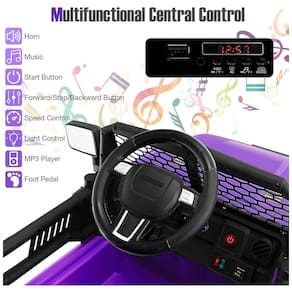 Controle central multifuncional Existem botões de música e buzina no volante para proporcionar às crianças uma experiência de direção mais realista. Além disso, o botão Iniciar, o controle de luz, a porta USB, o MP3 player e o botão de velocidade também o tornam super fácil de usar e adicionam diversão extra ao dirigir. As crianças não ficarão entediadas quando andarem neste carro.