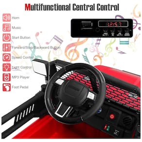 Controle central multifuncional Existem botões de música e buzina no volante para proporcionar às crianças uma experiência de direção mais realista. Além disso, o botão Iniciar, o controle de luz, a porta USB, o MP3 player e o botão de velocidade também o tornam super fácil de usar e adicionam diversão extra ao dirigir. As crianças não ficarão entediadas quando andarem neste carro.