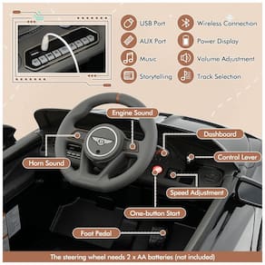 Permita que as crianças se divirtam ao dirigir com nosso carro Bentley licenciado! Oficialmente licenciado pela Bentley Bacalar, este brinquedo Rideon possui 2 motores potentes para excelente desempenho. As crianças podem experimentar uma experiência de direção realista com o volante, a alavanca de controle e o pedal. Com um painel multifuncional, você pode conectar seu telefone e realizar a seleção de faixas, bem como o ajuste de volume. Os faróis brancos, as luzes traseiras vermelhas e o painel iluminado trazem diversão extra. Mais importante ainda, as rodas grandes e texturizadas com sistema de suspensão por mola nas traseiras garantem uma condução suave. Além disso, existem 2 formas de carregamento. Uma é carregar através do orifício de carregamento e a outra é desconectar a bateria para carregamento direto.