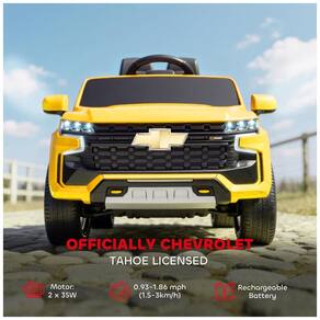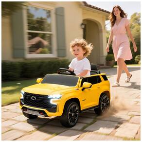 Marca: Aosom Modelo: Licensed Chevrolet Tahoe Cor: Amarelo Material: Metal e Polipropileno resistente Bateria: 12V 7AH recarregável Motores: 2 motores de 35W (motores duplos) Velocidades: 3 níveis ajustáveis (incluindo marchas para frente e ré) Suspensão: 4 rodas com sistema de suspensão para conforto Dimensões externas: 105 cm (comprimento) x 67 cm (largura) x 53 cm (altura) Diâmetro das rodas: 23 cm Peso do produto: 15,5 kg Capacidade máxima de peso: 25 kg Assento: Aproximadamente 35x20 cm com cinto de segurança Portas: Traváveis para maior segurança Recursos adicionais: Luzes LED, música integrada, conexão sem fio (bluetooth/USB), partida suave Controle remoto: Controle remoto para pais com função ligar/desligar, ajustes de velocidade e parada Indicado para crianças a partir de 3 anos Requer montagem por adulto Marca: Não Informado