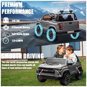 O carrinho elétrico infantil licenciado Chevrolet Colorado 24V da Nitoess é equipado com tração 4WD, bateria de 24V, motor potente e assentos duplos, suportando até 61 kg para duas crianças com conforto e segurança. Possui rodas de EVA de alta qualidade, proporcionando dirigibilidade estável em diversos terrenos como concreto, grama e cascalho.