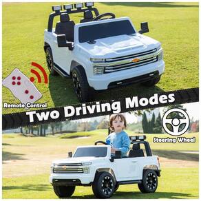 O caminhão é licenciado pela Chevrolet e inclui luzes funcionais, rádio multifuncional e sons realistas de motor, buzina e músicas infantis. Também possui conexões AUX e USB para que você possa reproduzir músicas ou histórias favoritas das crianças diretamente do seu dispositivo.