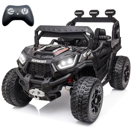 Durabilidade e Capacidade: Fabricado com um corpo de plástico PP durável e certificado pela ASTM F963, o UTV suporta uma carga máxima de 49,89 kg e alcança uma velocidade máxima de até 8 km/h. É um presente ideal para aniversários, Dia de Ação de Graças, Natal, Ano Novo e outras ocasiões especiais.