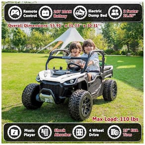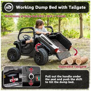 O caminhão basculante tem capacidade para duas crianças e é equipado com quatro suspensões de mola robustas, suportando uma carga máxima de 49,89 kg. A caçamba basculante elétrica com elevação automática e uma pá extra oferecem uma experiência única de transporte.