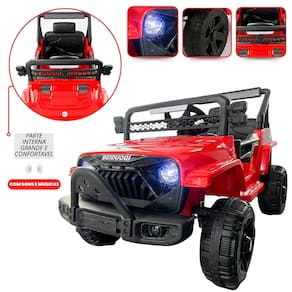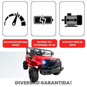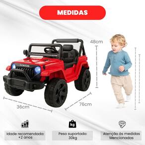Especificações Técnicas: - Modelo Jeep Rubicon - Dimensões (C x L x A) 96 cm x 59 cm x 57 cm - Peso Suportado Até 30 kg - Peso do Produto 12 kg - Bateria 2 baterias de 6V (12V no total) - Potência Total 720W