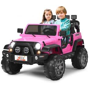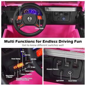 Caminhão de 2 lugares real Projetado com 2 lugares com cinto de segurança, este passeio de 12V em caminhão foi projetado para 2 crianças com 3 anos ou mais para brincar e aproveitar a emoção de dirigir juntas. E luzes LED, portas duplas magnéticas com trava, funções para frente e para trás e a função de ajuste de velocidade de três níveis proporcionam ao seu filho uma experiência real de direção.