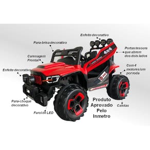 No painel de controle, alterna entre frente e ré; tem botão para ligar e desligar o Jipe; luzes de LED no farol dianteiro e na traseira; aceleração no pedal; emite sons como músicas, buzina e barulho de motor. Ambas as portas abrem, proporcionando à criança ainda mais conforto e diversão e possui assento anatômico com cinto de segurança, para tranquilidade dos pais. Para deixar o Jipe mais real, possui para-brisa, para-choque e faróis decorativos em cima e na frente (apenas decorativos).