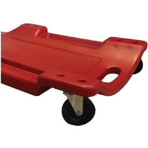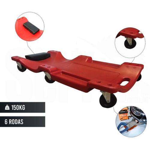 Capacidade de carga até 150kg; Formato anatômico; Apoio para cabeça estofado; 6 rodízios giratórios; Bandejas laterais para ferramentas; Alça para transporte.