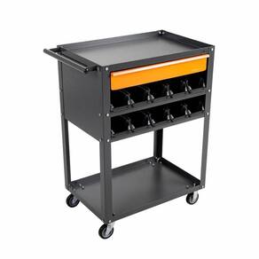 Carrinho de Ferramentas com 1 Gavetas e 2 Gavetas Separadoras Atende as necessidades de organização do local de trabalho e ainda transporta e pode ser utilizado como bancada de trabalho. Utilizado nas mais diversas aplicações como oficinas e chão de fábrica para organização de ferramentas e acessórios. O Carrinho é desmontável o que facilita e barateia o transporte. - Possui uma gaveta com corrediças telescópicas de ; - Com 4 Rodízios de 3, dois fixos e dois móveis - Maior resistência e durabilidade: tratamento químico antiferrugens, fosfatizante e pintura eletrostática a pó - Bandeja Reforçada - Tranca para cadeado - Cor: Cinza com detalhes laranja Profundidade: 600mm + 75mm do cabo Largura: 400mm Altura: 850mm Carga Máxima: 80Kg distribuídos Marca: Não Informado