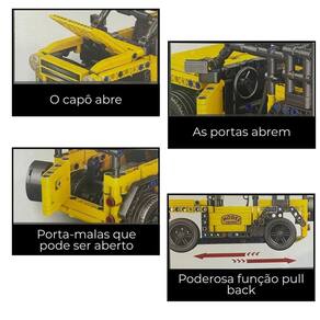 Especificações técnicas - material: peças em plástico abs resistente e não tóxico. - idade recomendada: +3 anos sob supervisão para menores de 5 anos . - número de peças: 478 inclui rodas, eixos, peças estruturais e acessórios . - funcionalidade: - sistema pull back movimento automático ao puxar . - partes móveis: capô, portas e porta-malas articuláveis. - cores principais: amarelo com detalhes em preto.