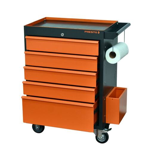 Carro Profissional p/ Ferramentas PRESTO c/ 5 Gavet as, fabricado em chapa de aço c/ baixo teor de carbono, c/ tratamento químico fosfatizante e antiferruginoso e pintura eletrostática a pó, o que garante uma proteção eficaz contra corrosão e um acabamento de alta qualidade.
