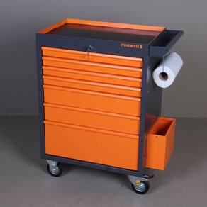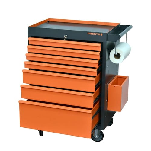 Carro Profissional para Ferramentas PRESTO c/ 7 Gavetas, fabricado em chapa de aço c/ baixo teor de carbono, c/ tratamento químico fosfatizante e antiferruginoso e pintura eletrostática a pó, o que garante uma proteção eficaz contra corrosão e um acabamento de alta qualidade.