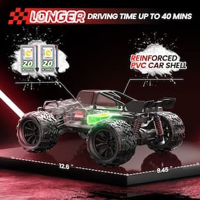 DEERC Carro RC de alta velocidade 9500E com pneus atualizados, caminhão monstro RC escala 1:16, carro de passatempo de corrida, 40 kmh, carro de controle remoto off-road 4WD todo-o-terreno, rastreador RC de 2,4 GHz, 2 baterias, presente de brinquedo para crianças, adultos - ?Motor duplo potente para super velocidade?: Motores duplos integrados fornecem grande potência, dando a você mais de 40 km/h de emoção de corrida de alta velocidade. Motor potente também fornece essa capacidade de escalada de caminhão monstro rc. Pode subir em encostas de 50 graus sem esforço. - ?Caminhão monstro 4WD All Terrain?: Este caminhão de controle remoto autêntico está equipado com chassi de carro de nylon elástico e premium extremamente durável. Com motor de direção tenso de 1,8 kg, servo de alto torque e direção e acelerador proporcionais, este carro RC hobby é capaz de conquistar terrenos muito mais difíceis e permitir que este veículo off-road viaje livremente e facilmente em estradas irregulares. O design à prova de respingos e rodas mais largas resistentes permitem que você dirija este caminhão monstro em todos os terrenos. - ?Carcaça de carro de PVC reforçado Badass?: além de garantir a excelente função deste veículo off-road, fizemos um ótimo esforço para oferecer a você uma experiência visual legal com todo o graffiti de design personalizado, incluindo o esqueleto na parte superior da carcaça do carro. - ?2 baterias recarregáveis e sistema de controle de 2,4 GHz?: Este rastreador de rochas está equipado com bateria recarregável de grande capacidade de 7,4 V 1500 mAh. 2 baterias darão a você muito tempo de condução e diversão sem parar. O sistema de controle anti-interferência torna possível executar vários caminhões RC juntos, correndo e se unindo com amigos e familiares. - ?Presentes incríveis para crianças e adultos?: Este caminhão de controle remoto possui aderência, operação e durabilidade extraordinárias. É projetado para usuários de nível básico e intermediário. Se você está procurando um presente extra legal e emocionante, este carro de controle remoto DEERC seria a escolha perfeita.