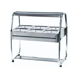 Self Service 6 Cubas para Salada Construído em aço inox brilhante AISI430, cubas gastronômicas (GNs) em aço inox AISI304, estrutura tubular com pintura eletrostática, rodízios com trava ou niveladores, protetor salivar em aço inox brilhante AISI430 e iluminação fluorescente. Voltagem 220V. Modelo SaladaGelo-x. Tamanho