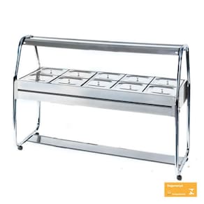 Construído em aço inox brilhante AISI430, cubas gastronômicas (GNs) em aço inox AISI304, estrutura tubular com pintura eletrostática, rodízios com trava ou niveladores, protetor salivar em aço inox brilhante AISI430 e iluminação fluorescente. Voltagem 220V.