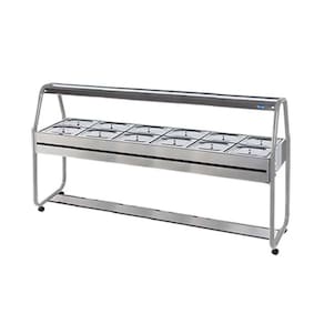 Construído em aço inox brilhante AISI430, cubas gastronômicas (GNs) em aço inox AISI304, estrutura tubular com pintura eletrostática, rodízios com trava ou niveladores, protetor salivar em aço inox brilhante AISI430 e iluminação fluorescente. Voltagem 220V.