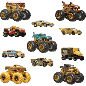 - O pacote múltiplo Hot Wheels Monster Trucks Bigfoot Trophy Champions celebra o 50º aniversário dos primeiros monster trucks com 5 caminhões de brinquedo e 6 carros de brinquedo.