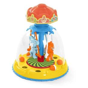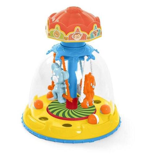 Gira, gira com efeito visual! o ursinho, o cachorrinho e macaquinho estão a postos para iniciar a diversão. é só apertar o teto para a brincadeira começar! enquanto o carrossel gira, as bolinhas saltam a base central se movimenta sob um efeito visual. uma experiência visual que desperta e ajuda a desenvolver a capacidade cognitiva das crianças. ao apertar o teto do carrosel, os bichinhos giram e as bolinhas pulam.
