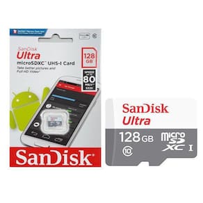 Cartão de memória micro sd de 128gb sandisk ultra marca: sandisk modelo: ultra sdsquns-128g-gn6mn cor: branco/cinza capacidade: 128gb velocidade de leitura máxima: 80mb/s tipo: micro sdxc uhs-i - class 10 peso bruto g : 11 dimensões da embalagem cm : 10. 2 x 0. 4 x 15. 2 capacidade de armazenamento: 128gb acompanha.