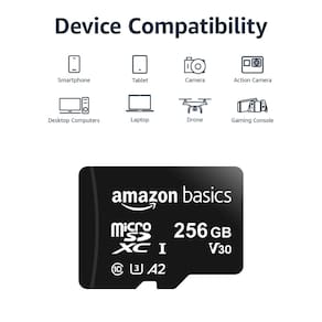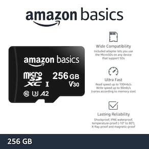 Cartão de memória Micro SDXC Amazon Basics com adaptador de tamanho completo, A2, U3, velocidade de leitura de até 100 MB/s, 256 GB, preto