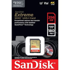 Projetado para equipamentos que podem capturar vídeo Full HD, 3D e 4K, bem como fotografia raw e burst, este cartão de memória SDXC Extreme UHS-I da SanDisk tem capacidade de 256GB, é compatível com o barramento UHS-I e possui uma classificação de classe de velocidade V30, que garante velocidades mínimas de gravação de 30MB/s. Se o seu dispositivo não suporta o padrão V30, este cartão também suporta o padrão U3, que também garante velocidades mínimas de gravação de 30MB/s. As velocidades de leitura são suportadas até 180MB/s e a velocidades de gravação máxima é de 130 MB/s. Possui um interruptor de proteção contra gravação que ajuda a proteger contra o apagamento acidental dos dados.