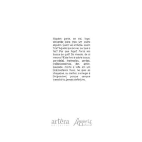 Alguém parte, se vai, foge, deixando para trás um outro alguém. Quem vai embora, quem fica? Aquele que se vai, por que o faz? Por que foge? Parte em busca do quê? Do mundo, de si mesmo? Este livro é sobre busca, partida(s), travessias, perdas, (re)descobertas, dor, amor, saudade, morte e vida em um (in)constante fluxo, no qual as chegadas, ou melhor, o chegar é (im)possível, porque sempre transitório, jamais definitivo. Marca: Não Informado
