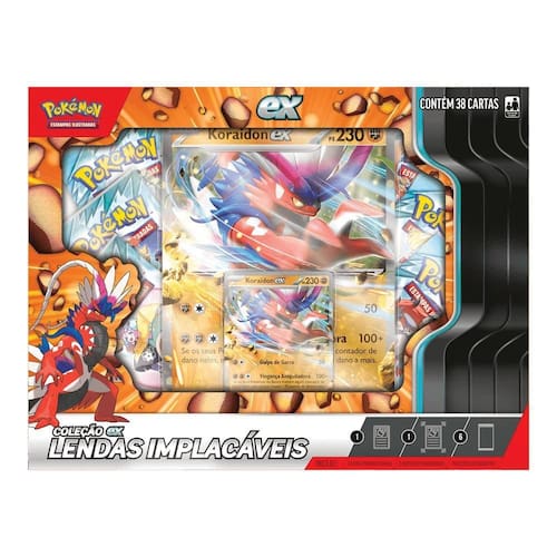 Cartas Pokémon Lendas Implacáveis ex Koraidon e Zacian - Copag Desperte o poder selvagem de Paldea com o lendário Koraidon ex e Zacian ex na coleção Pokémon Lendas Implacáveis da Copag. Esta edição especial traz toda a força e imponência de Koraidon e Zacian para suas batalhas do Pokémon Estampas Ilustradas, com uma carta holográfica promocional e uma versão extragrande que impressiona desde o primeiro olhar. Perfeita para jogadores e colecionadores a partir de 4 anos, a coleção inclui seis pacotes de booster para turbinar seu deck, além de uma carta codificada para usar no Pokémon Estampas Ilustradas Live. Ideal para quem busca estratégia, raciocínio e muita diversão em partidas com dois ou mais jogadores. Com selo de qualidade INMETRO e acabamento premium, esta é uma escolha obrigatória para fãs da nova geração Pokémon. Principais Características: - Idade Recomendada: A Partir de 4 Anos - Tipo de Jogo: Estratégia, Para Colecionar, Raciocínio - Quantidade de Pessoas 2 ou mais - Possui 1 carta holográfica promocional - 1 carta holográfica - 1 carta holográfica extragrande - 6 pacotes de booster do Pokémon Estampas Ilustradas - 1 carta codificada para o Pokémon Estampas Ilustradas Live Especificações Técnicas: - Conteúdo da Embalagem: Contém 37 unidades de cartas no formato 63mm x 88mm + 1 unidade de carta no formato 133mm x 187mm. - Material/ Composição: Cartão - : 30 Dias Contra Defeito de Fabricação pelo Fabricante - Certificação: INMETRO 008 140/2021 - Código do Fabricante: 10392-1/ 10392-2 - EAN: 7896192352385/ 7896192352453 - Marca: Copag Imagens meramente ilustrativas, as cores e estampas podem variar de acordo com o lote do fabricante Marca: Não Informado