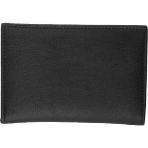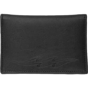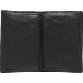Carteira fina em material não natural, com acabamento fosco, recorte na parte externa, com logo em baixo relevo, compartimentos internos para cartões e notas, além de etiquetas personalizadas.