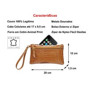 Clutch, carteira, porta celular e bolsa de mão em couro, muito versátil, possui 1 bolso externo fechado por zíper para pequenos objetos, todos os metais (argola, mosquetões, zíperes, etc) são dourados para dar um ar de sofisticação e elegância. O fechamento principal é feito com zíper para sua maior segurança. Possui alça externa de mão, excelente para uso no dia a dia. Possui a medida ideal para levar pequenos objetos, carteiras pequenas, celulares de tamanhos médio e grande, etc.