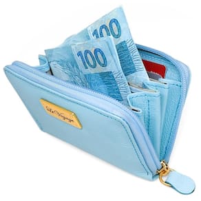 Composição: - 01 bolso com zíper para moedas ou pequenos itens - 06 compartimentos para cartões - 04 divisórias para cédulas dobradas, documentos e itens semelhantes
