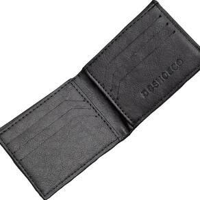 Carteira Dc Sheos com gravação em baixo relevo externo e interno, compartimento para notas, divisor de cartões e etiquetas personalizadas.